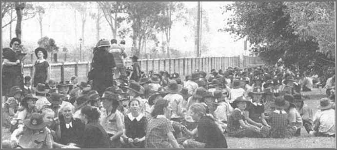 These are a whole lot of the kids waiting for transportation to the church, they don't look too worried about the fate of the school... do they <grin>?