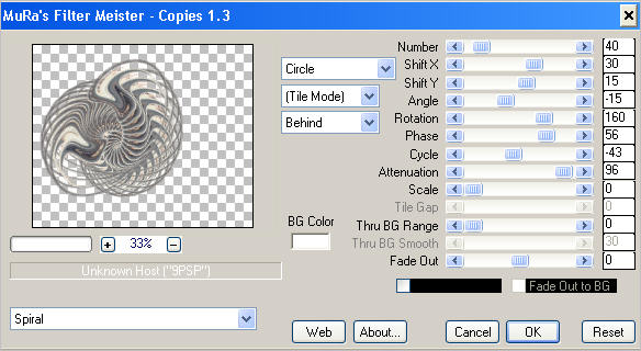 EFFECTS >>> PLUGINS >>> Mura's Filter Meister >>> Copies >> Spiral